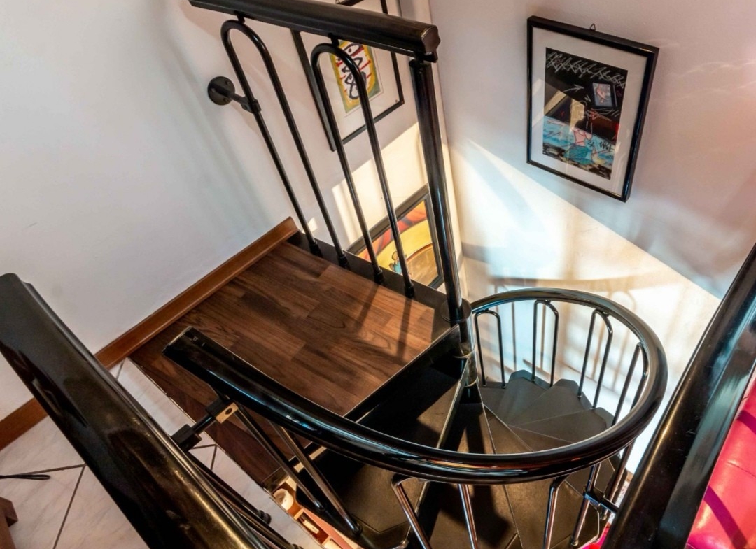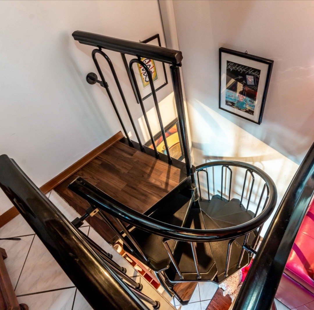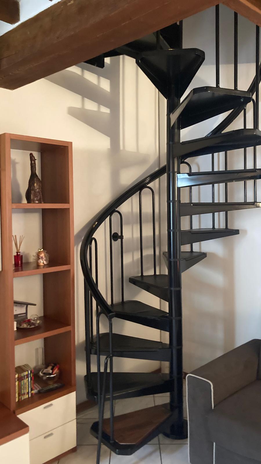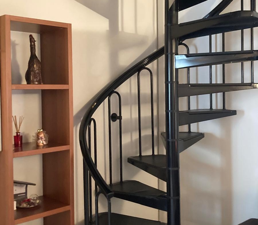La scala a chiocciola porta alla mansarda con camera matrimoniale (letto alla francese, piazza e mezza)